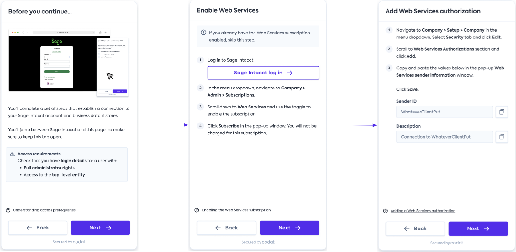 - It caters for both user-based and role-based Sage Intacct companyCompany In Codat, a company represents your customer's business entity. Companies can have multiple connections to different data sources. setups, adjusting the journey accordingly.